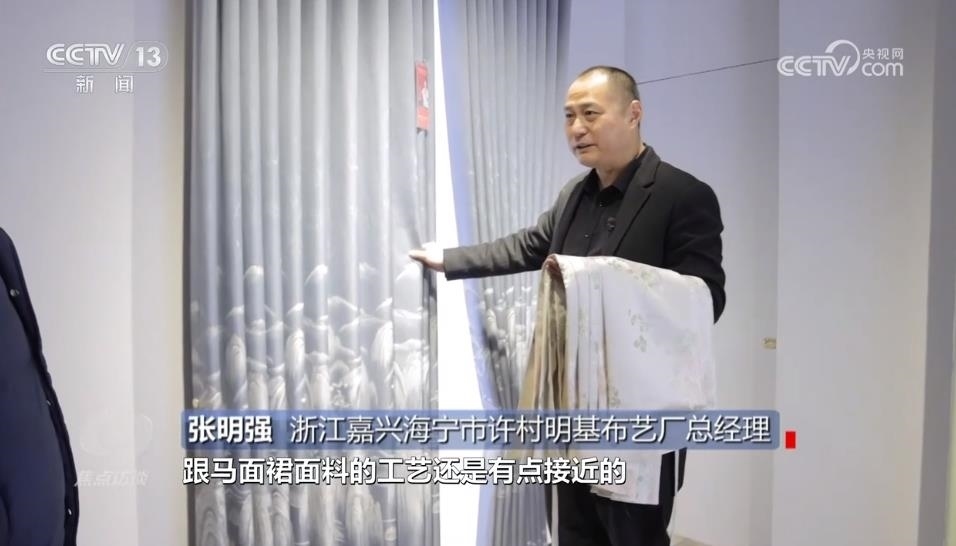浙江嘉興海寧市許村明基布藝廠總經(jīng)理張明強(qiáng):“提花其實(shí)比較接近,跟馬面裙面料的工藝有點(diǎn)接近,但是馬面裙的密度會(huì)超過(guò)它很多。”