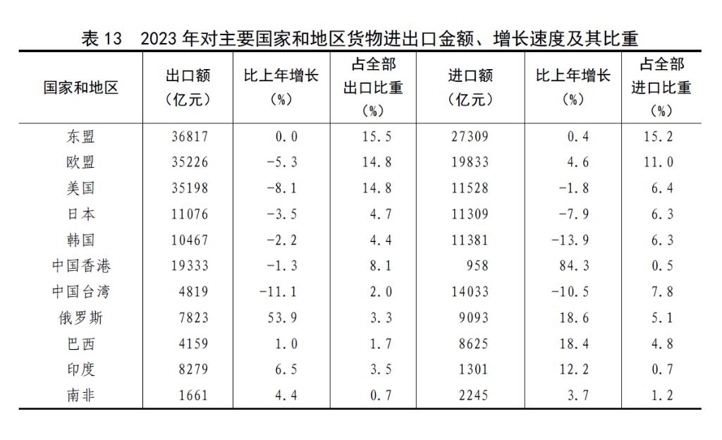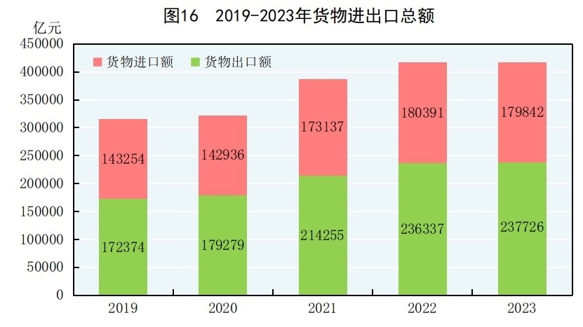 全年貨物進(jìn)出口總額417568億元,比上年增長(zhǎng)0.2%。其中,出口237726億元,增長(zhǎng)0.6%;進(jìn)口179842億元,下降0.3%。貨物進(jìn)出口順差57883億元,比上年增加1938億元。對(duì)共建“一帶一路”[46]國(guó)家進(jìn)出口額194719億元,比上年增長(zhǎng)2.8%。其中,出口107314億元,增長(zhǎng)6.9%;進(jìn)口87405億元,下降1.9%。對(duì)《區(qū)域全面經(jīng)濟(jì)伙伴關(guān)系協(xié)定》(RCEP)其他成員國(guó)[47]進(jìn)出口額125967億元,比上年下降1.6%。民營(yíng)企業(yè)進(jìn)出口額223601億元,比上年增長(zhǎng)6.3%,占進(jìn)出口總額比重為53.5%。