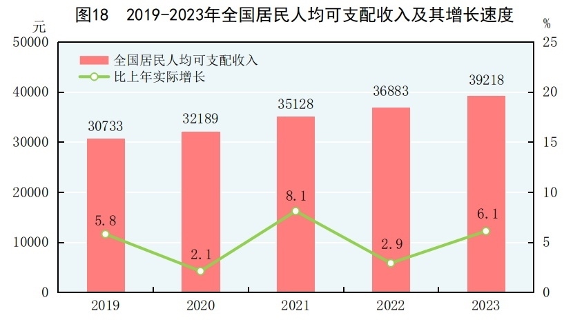 全年全國(guó)居民人均可支配收入39218元,比上年增長(zhǎng)6.3%,扣除價(jià)格因素,實(shí)際增長(zhǎng)6.1%。全國(guó)居民人均可支配收入中位數(shù)[56]33036元,增長(zhǎng)5.3%。按常住地分,城鎮(zhèn)居民人均可支配收入51821元,比上年增長(zhǎng)5.1%,扣除價(jià)格因素,實(shí)際增長(zhǎng)4.8%。城鎮(zhèn)居民人均可支配收入中位數(shù)47122元,增長(zhǎng)4.4%。農(nóng)村居民人均可支配收入21691元,比上年增長(zhǎng)7.7%,扣除價(jià)格因素,實(shí)際增長(zhǎng)7.6%。農(nóng)村居民人均可支配收入中位數(shù)18748元,增長(zhǎng)5.7%。城鄉(xiāng)居民人均可支配收入比值為2.39,比上年縮小0.06。按全國(guó)居民五等份收入分組[57],低收入組人均可支配收入9215元,中間偏下收入組人均可支配收入20442元,中間收入組人均可支配收入32195元,中間偏上收入組人均可支配收入50220元,高收入組人均可支配收入95055元。全國(guó)農(nóng)民工人均月收入4780元,比上年增長(zhǎng)3.6%。脫貧縣[58]農(nóng)村居民人均可支配收入16396元,比上年增長(zhǎng)8.5%,扣除價(jià)格因素,實(shí)際增長(zhǎng)8.4%。