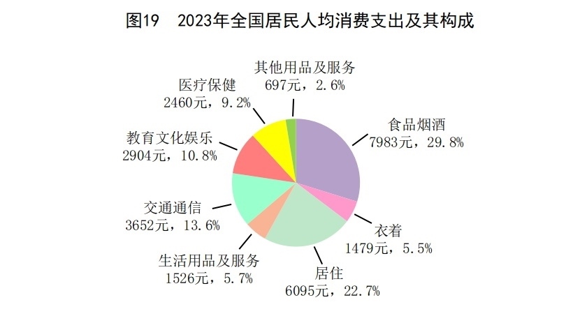 全年全國(guó)居民人均消費(fèi)支出26796元,比上年增長(zhǎng)9.2%,扣除價(jià)格因素,實(shí)際增長(zhǎng)9.0%。其中,人均服務(wù)性消費(fèi)支出[59]12114元,比上年增長(zhǎng)14.4%,占居民人均消費(fèi)支出比重為45.2%。按常住地分,城鎮(zhèn)居民人均消費(fèi)支出32994元,增長(zhǎng)8.6%,扣除價(jià)格因素,實(shí)際增長(zhǎng)8.3%;農(nóng)村居民人均消費(fèi)支出18175元,增長(zhǎng)9.3%,扣除價(jià)格因素,實(shí)際增長(zhǎng)9.2%。全國(guó)居民恩格爾系數(shù)為29.8%,其中城鎮(zhèn)為28.8%,農(nóng)村為32.4%。