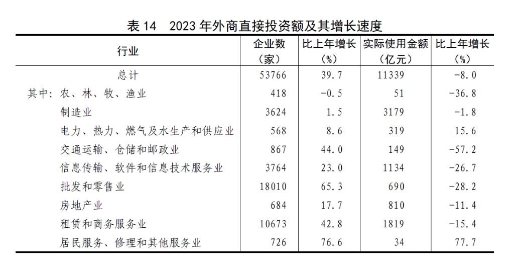 全年外商直接投資新設(shè)立企業(yè)53766家,比上年增長(zhǎng)39.7%。實(shí)際使用外商直接投資額11339億元,下降8.0%,折1633億美元,下降13.7%。其中,共建“一帶一路”國(guó)家對(duì)華直接投資(含通過(guò)部分自由港對(duì)華投資)新設(shè)立企業(yè)13649家,增長(zhǎng)82.7%;對(duì)華直接投資額1221億元,下降11.4%,折176億美元,下降16.7%。高技術(shù)產(chǎn)業(yè)實(shí)際使用外資額4233億元,下降4.9%,折610億美元,下降10.8%。
