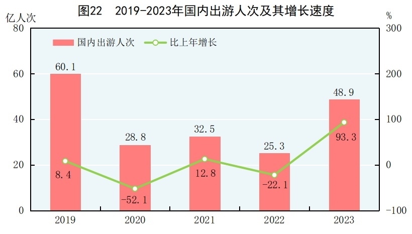 全年國(guó)內(nèi)出游48.9億人次,比上年增長(zhǎng)93.3%。其中,城鎮(zhèn)居民國(guó)內(nèi)出游37.6億人次,增長(zhǎng)94.9%;農(nóng)村居民國(guó)內(nèi)出游11.3億人次,增長(zhǎng)88.5%。國(guó)內(nèi)游客出游總花費(fèi)49133億元,增長(zhǎng)140.3%。其中,城鎮(zhèn)居民出游花費(fèi)41781億元,增長(zhǎng)147.5%;農(nóng)村居民出游花費(fèi)7353億元,增長(zhǎng)106.4%。入境游客8203萬(wàn)人次,其中外國(guó)人1378萬(wàn)人次,香港、澳門(mén)和臺(tái)灣同胞6824萬(wàn)人次。入境游客總花費(fèi)530億美元。國(guó)內(nèi)居民出境10096萬(wàn)人次,其中因私出境9684萬(wàn)人次,赴港澳臺(tái)出境7704萬(wàn)人次。