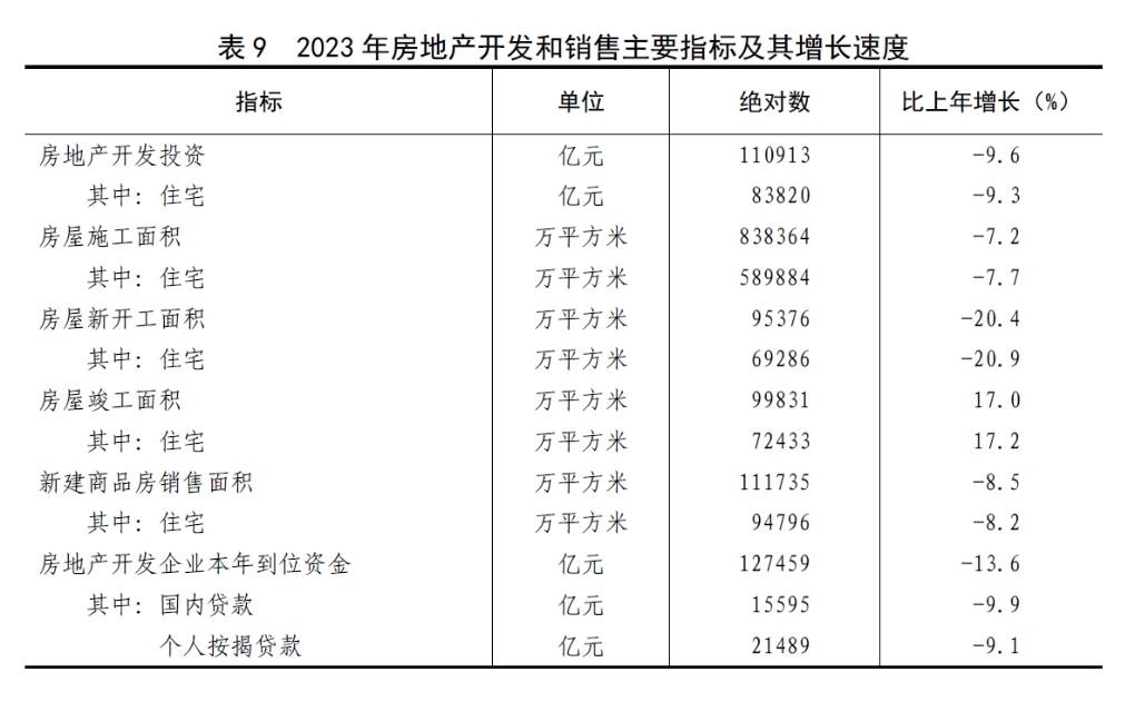 全年房地產(chǎn)開(kāi)發(fā)投資110913億元,比上年下降[43]9.6%。其中住宅投資83820億元,下降9.3%;辦公樓投資4531億元,下降9.4%;商業(yè)營(yíng)業(yè)用房投資8055億元,下降16.9%。全年新建商品房銷售面積[44]111735萬(wàn)平方米。二手房交易網(wǎng)簽面積[45]70882萬(wàn)平方米。年末新建商品房待售面積67295萬(wàn)平方米,其中商品住宅待售面積33119萬(wàn)平方米。