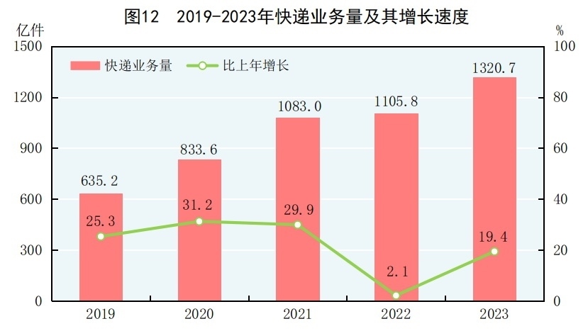 全年完成郵政行業(yè)寄遞業(yè)務(wù)總量[29]1625億件,比上年增長(zhǎng)16.8%。郵政業(yè)完成郵政函件業(yè)務(wù)9.7億件,包裹業(yè)務(wù)0.2億件,快遞業(yè)務(wù)量1320.7億件,快遞業(yè)務(wù)收入12074億元。全年完成電信業(yè)務(wù)總量[30]18327億元,比上年增長(zhǎng)16.8%。年末移動(dòng)電話基站數(shù)[31]1162萬(wàn)個(gè),其中4G基站629萬(wàn)個(gè),5G基站338萬(wàn)個(gè)。全國(guó)電話用戶總數(shù)189992萬(wàn)戶,其中移動(dòng)電話用戶172660萬(wàn)戶。移動(dòng)電話普及率為122.5部/百人。固定互聯(lián)網(wǎng)寬帶接入用戶[32]63631萬(wàn)戶,比上年末增加4666萬(wàn)戶,其中100M速率及以上的寬帶接入用戶[33]60136萬(wàn)戶,增加4756萬(wàn)戶。蜂窩物聯(lián)網(wǎng)終端用戶[34]23.32億戶,增加4.88億戶?;ヂ?lián)網(wǎng)上網(wǎng)人數(shù)10.92億人,其中手機(jī)上網(wǎng)人數(shù)10.91億人?;ヂ?lián)網(wǎng)普及率為77.5%,其中農(nóng)村地區(qū)互聯(lián)網(wǎng)普及率為66.5%。全年移動(dòng)互聯(lián)網(wǎng)用戶接入流量3015億GB,比上年增長(zhǎng)15.2%。軟件和信息技術(shù)服務(wù)業(yè)[35]完成軟件業(yè)務(wù)收入123258億元,比上年增長(zhǎng)13.4%。