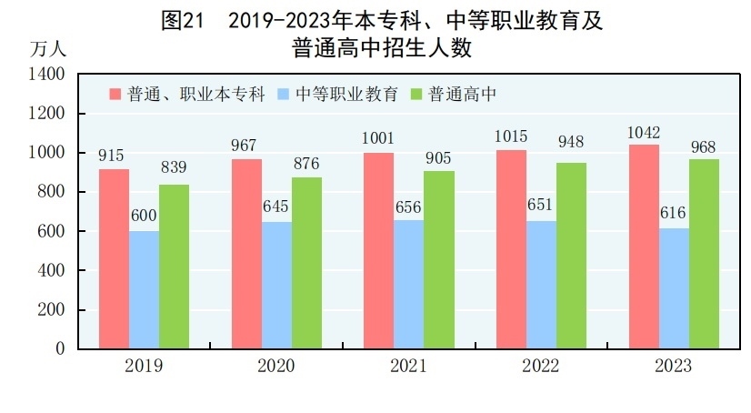 全年研究生教育招生130.2萬(wàn)人,在學(xué)研究生388.3萬(wàn)人,畢業(yè)生101.5萬(wàn)人。普通、職業(yè)本專科[70]招生1042.2萬(wàn)人,在校生3775.0萬(wàn)人,畢業(yè)生1047.0萬(wàn)人。中等職業(yè)教育[71]招生616.5萬(wàn)人,在校生1737.9萬(wàn)人,畢業(yè)生537.1萬(wàn)人。普通高中招生967.8萬(wàn)人,在校生2803.6萬(wàn)人,畢業(yè)生860.4萬(wàn)人。初中招生1754.6萬(wàn)人,在校生5243.7萬(wàn)人,畢業(yè)生1623.6萬(wàn)人。普通小學(xué)招生1877.9萬(wàn)人,在校生10836.0萬(wàn)人,畢業(yè)生1763.5萬(wàn)人。特殊教育招生15.5萬(wàn)人,在校生91.2萬(wàn)人,畢業(yè)生17.3萬(wàn)人。學(xué)前教育在園幼兒4093.0萬(wàn)人。九年義務(wù)教育鞏固率為95.7%,高中階段毛入學(xué)率為91.8%。