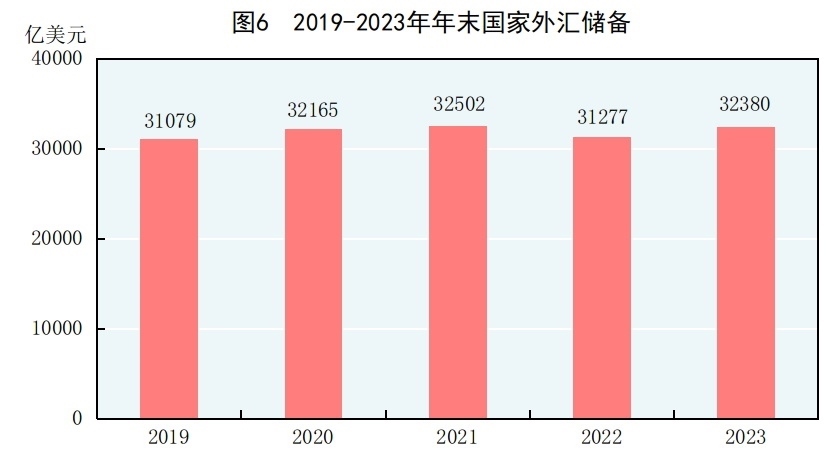 年末國(guó)家外匯儲(chǔ)備32380億美元,比上年末增加1103億美元。全年人民幣平均匯率為1美元兌7.0467元人民幣,比上年貶值4.5%。