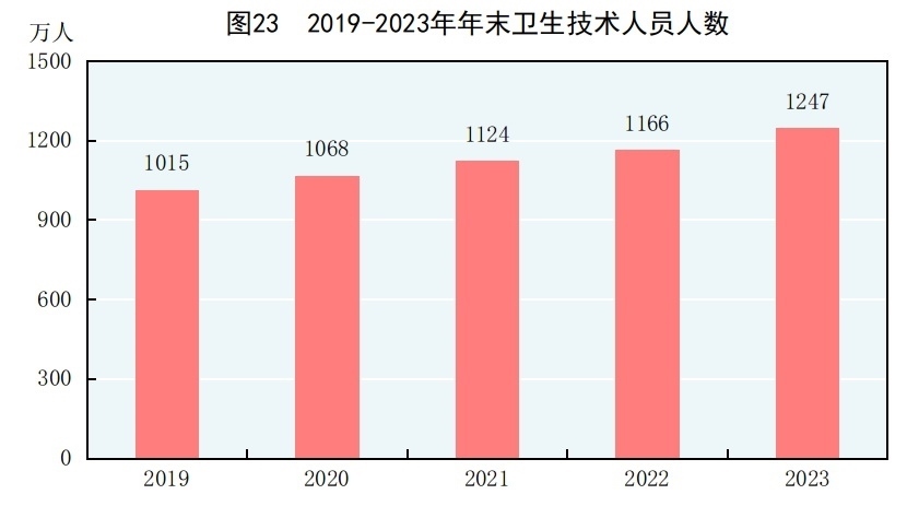 年末全國(guó)共有醫(yī)療衛(wèi)生機(jī)構(gòu)107.1萬(wàn)個(gè),其中醫(yī)院3.9萬(wàn)個(gè),在醫(yī)院中有公立醫(yī)院1.2萬(wàn)個(gè),民營(yíng)醫(yī)院2.7萬(wàn)個(gè);基層醫(yī)療衛(wèi)生機(jī)構(gòu)101.6萬(wàn)個(gè),其中鄉(xiāng)鎮(zhèn)衛(wèi)生院3.4萬(wàn)個(gè),社區(qū)衛(wèi)生服務(wù)中心(站)3.7萬(wàn)個(gè),門(mén)診部(所)36.2萬(wàn)個(gè),村衛(wèi)生室58.3萬(wàn)個(gè);專業(yè)公共衛(wèi)生機(jī)構(gòu)1.2萬(wàn)個(gè),其中疾病預(yù)防控制中心3426個(gè),衛(wèi)生監(jiān)督所(中心)2791個(gè)。衛(wèi)生技術(shù)人員1247萬(wàn)人,其中執(zhí)業(yè)醫(yī)師和執(zhí)業(yè)助理醫(yī)師478萬(wàn)人,注冊(cè)護(hù)士563萬(wàn)人。醫(yī)療衛(wèi)生機(jī)構(gòu)床位1020萬(wàn)張,其中醫(yī)院800萬(wàn)張,鄉(xiāng)鎮(zhèn)衛(wèi)生院151萬(wàn)張。全年總診療人次[75]95.6億人次,出院人次[76]3.0億人次。