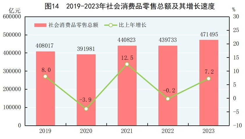 全年社會(huì)消費(fèi)品零售總額471495億元,比上年增長(zhǎng)7.2%。按經(jīng)營(yíng)地分,城鎮(zhèn)消費(fèi)品零售額407490億元,增長(zhǎng)7.1%;鄉(xiāng)村消費(fèi)品零售額64005億元,增長(zhǎng)8.0%。按消費(fèi)類型分,商品零售額418605億元,增長(zhǎng)5.8%;餐飲收入52890億元,增長(zhǎng)20.4%。服務(wù)零售額[36]比上年增長(zhǎng)20.0%。