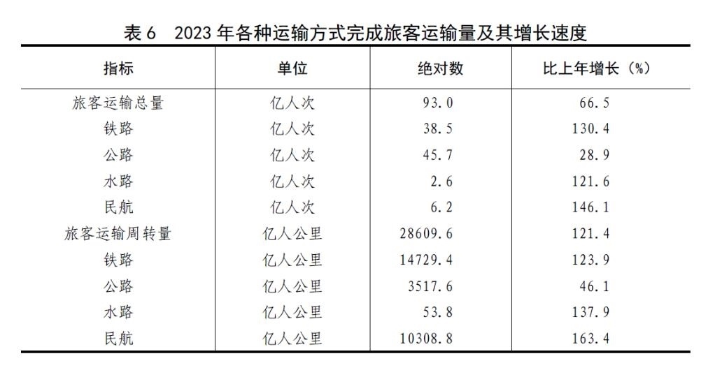 全年旅客運(yùn)輸總量93億人次,比上年增長(zhǎng)66.5%。旅客運(yùn)輸周轉(zhuǎn)量28610億人公里,增長(zhǎng)121.4%。