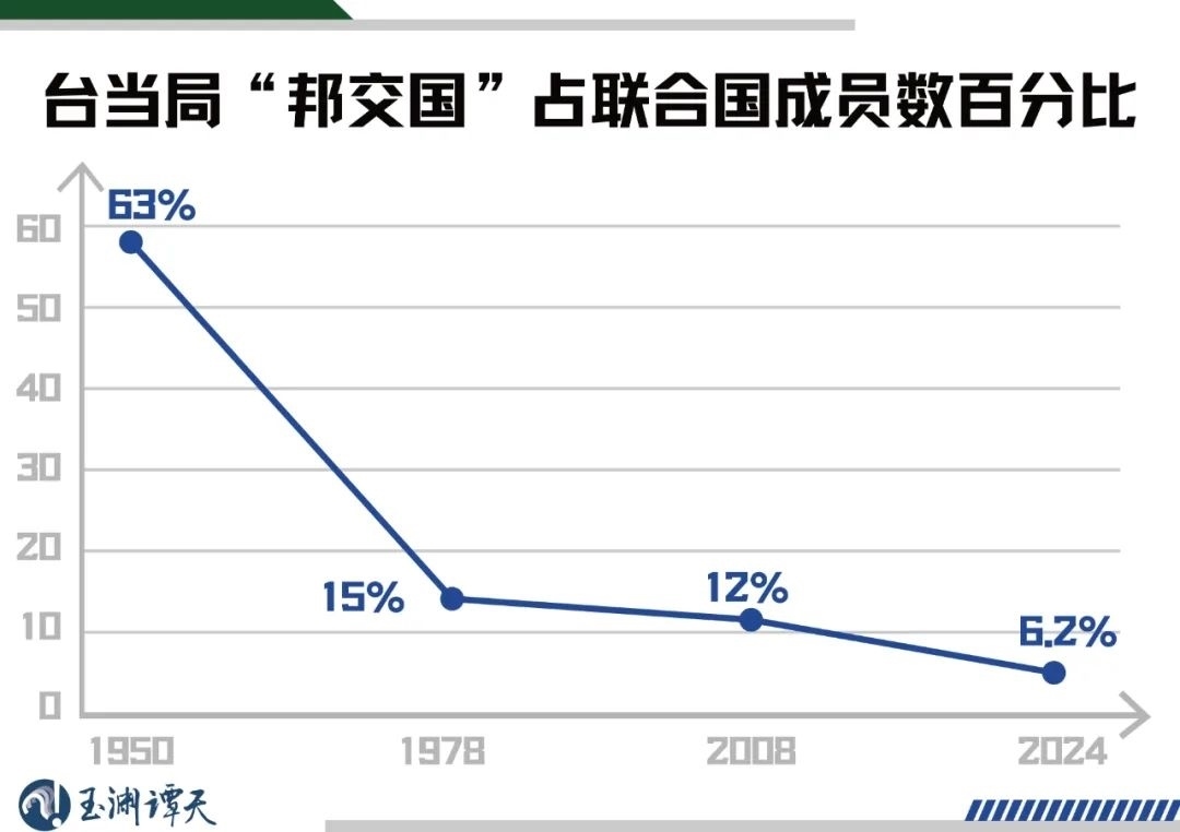 可以看到,1950年,臺(tái)灣當(dāng)局“邦交國”數(shù)量占聯(lián)合國成員國數(shù)量的比例,還高達(dá)63%。