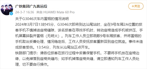 ·廣鐵通報G3046次車內(nèi)冒煙:乘客手機被擠壓后屏幕碎裂所致。