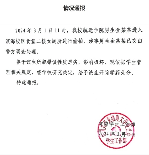 ·渤海大學一男生進入食堂女廁偷拍,被開除學籍。