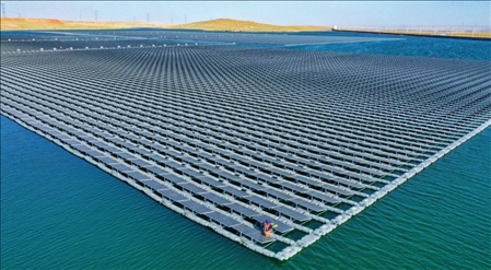 位于寧夏靈武市的國家能源集團(tuán)寧夏電力公司寧東電廠3×5.98兆瓦漂浮分布式光伏發(fā)電項目(2022年6月17日攝)王鵬攝/本刊
