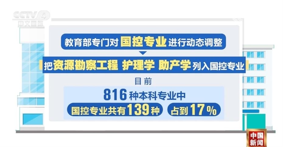 此次教育部專門對國控專業(yè)進行了動態(tài)調整,把資源勘察工程、護理學、助產學列入了國控專業(yè)。目前,816種本科專業(yè)中,國控專業(yè)共有139種,占到17%。未來,國控專業(yè)范圍還將進行“有進有出”的動態(tài)調整。