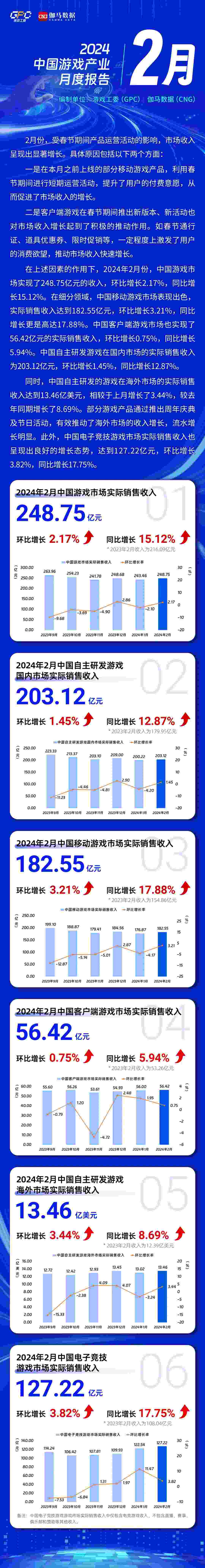 央視網(wǎng)消息:3月20日,據(jù)中國(guó)音數(shù)協(xié)游戲工委官微消息,2024年2月中國(guó)游戲產(chǎn)業(yè)月度報(bào)告發(fā)布。報(bào)告顯示,2024年2月份,中國(guó)游戲市場(chǎng)實(shí)現(xiàn)了248.75億元的收入,環(huán)比增長(zhǎng)2.17%,同比增長(zhǎng)15.12%。在細(xì)分領(lǐng)域,中國(guó)移動(dòng)游戲市場(chǎng)表現(xiàn)出色,實(shí)際銷售收入達(dá)到182.55億元,環(huán)比增長(zhǎng)3.21%,同比增長(zhǎng)更是高達(dá)17.88%。中國(guó)客戶端游戲市場(chǎng)也實(shí)現(xiàn)了56.42億元的實(shí)際銷售收入,環(huán)比增長(zhǎng)0.75%,同比增長(zhǎng)5.94%。中國(guó)自主研發(fā)游戲在國(guó)內(nèi)市場(chǎng)的實(shí)際銷售收入為203.12億元,環(huán)比增長(zhǎng)1.45%,同比增長(zhǎng)12.87%。