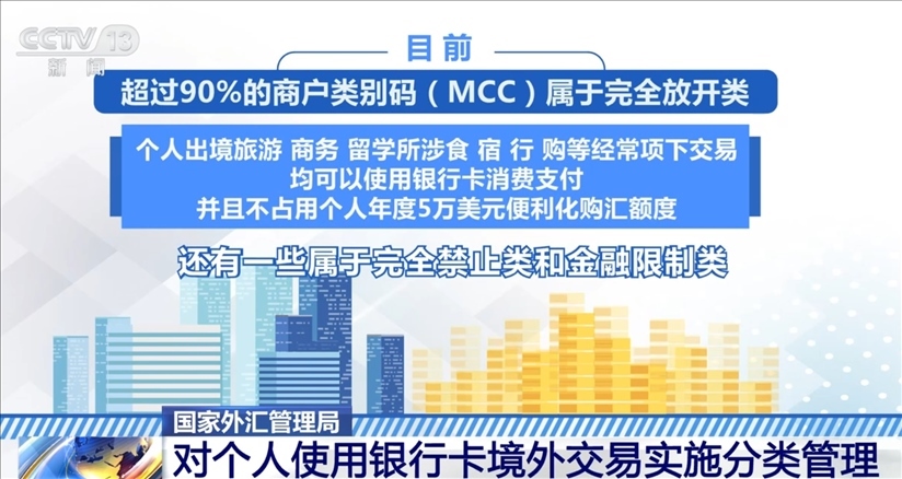 根據(jù)規(guī)定,目前,超過90%的商戶類別碼屬于完全放開類,個(gè)人出境旅游、商務(wù)、留學(xué)所涉食、宿、行、購等經(jīng)常項(xiàng)下交易,均可以使用銀行卡消費(fèi)支付,并且不占用個(gè)人年度5萬美元便利化購匯額度。此外,還有一些屬于完全禁止類和金融限制類。