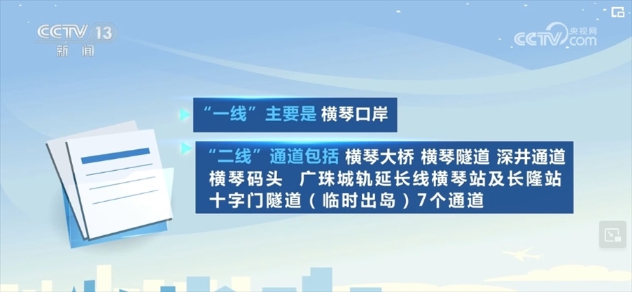 “一線”主要是橫琴口岸,“二線”通道包括橫琴大橋、橫琴隧道、深井通道、橫琴碼頭、廣珠城軌延長(zhǎng)線橫琴站及長(zhǎng)隆站、十字門隧道(臨時(shí)出島)7個(gè)通道。