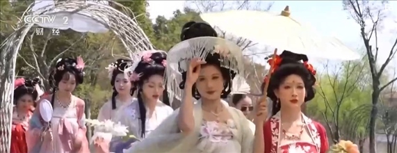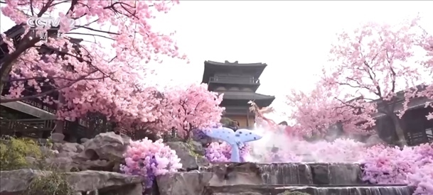 在江蘇常州,百萬株郁金香競相開放。櫻花、玉蘭、垂絲海棠等花木也開滿山谷,一簇簇粉白的花朵隨微風搖曳,宛若世外桃源。伴著音樂,十二花神身著漢服踏春而來,構成本次花朝節(jié)一道亮麗的風景線。