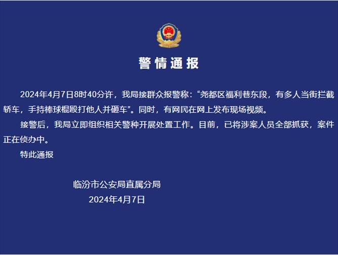 ·臨汾警方通報(bào)多人持棒球棍毆打他人并砸車:涉案人員全部抓獲。