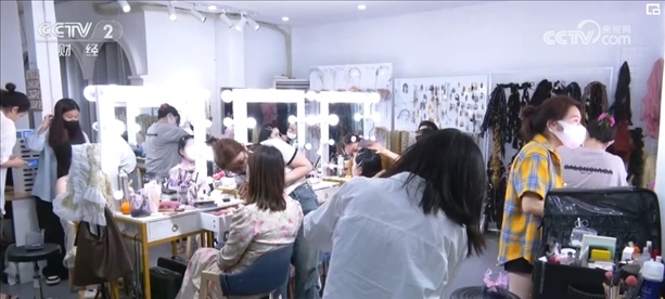 晚上8時(shí),在這家寫真店,仍有不少消費(fèi)者在做妝造。負(fù)責(zé)人介紹,潑水節(jié)期間,他們的客流量比平時(shí)多了一倍。