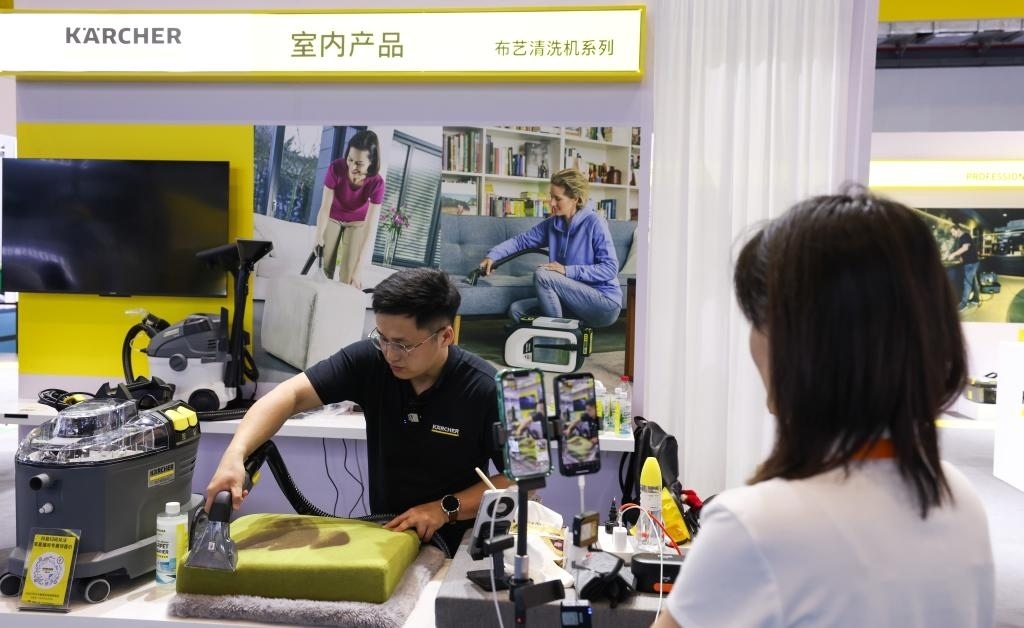 “友友們,現(xiàn)在進入‘云’逛消博會時間,大家可以通過直播試擦,感受這款鏡面清潔機的功能。”一邊在展臺發(fā)布新品,一邊引導消費者進入直播間購買,卡赫現(xiàn)場工作人員陳女士忙得不亦樂乎。據(jù)她介紹,這是公司第一次在消博會上使用直播帶貨形式,“效果不錯,剛剛就有不少粉絲下單”。