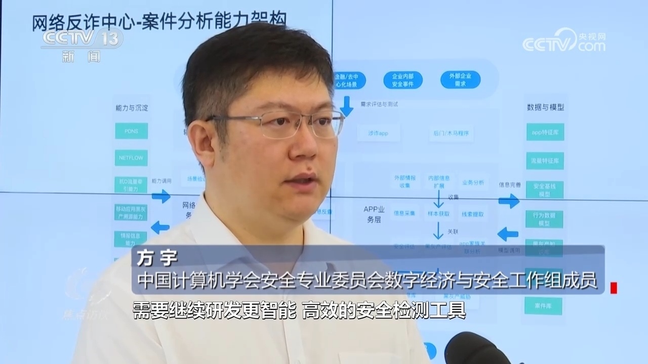 方宇:“下一步,針對(duì)涉詐APP的發(fā)現(xiàn),需要繼續(xù)研發(fā)更智能、高效的安全檢測工具,建立涉詐APP的黑名單數(shù)據(jù)庫。另外,結(jié)合一些新型、智能化的技術(shù)手段,通過對(duì)網(wǎng)絡(luò)流量分析,及時(shí)發(fā)現(xiàn)詐騙流量,并通過公安、網(wǎng)信、金融、市場監(jiān)管等部門進(jìn)一步加強(qiáng)聯(lián)動(dòng)、信息及時(shí)共享、及時(shí)進(jìn)行阻斷,多措并舉,共同努力,形成合力,打擊涉詐APP?!?/p>