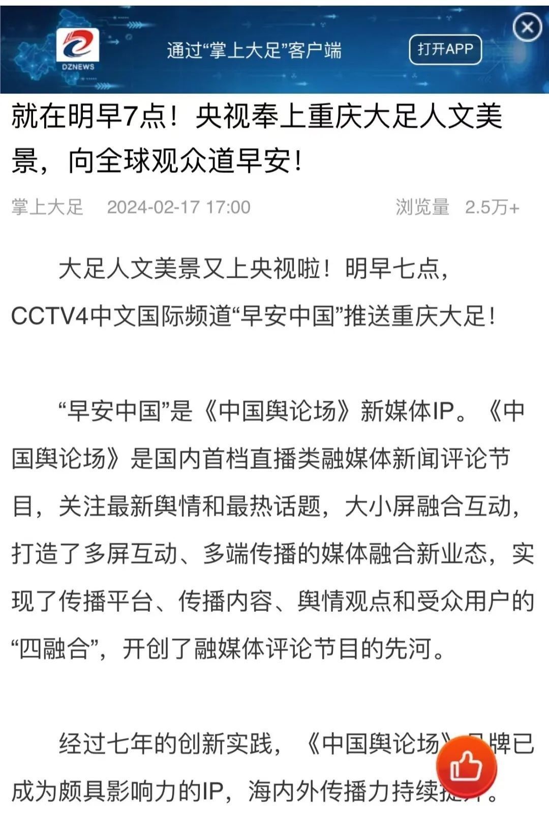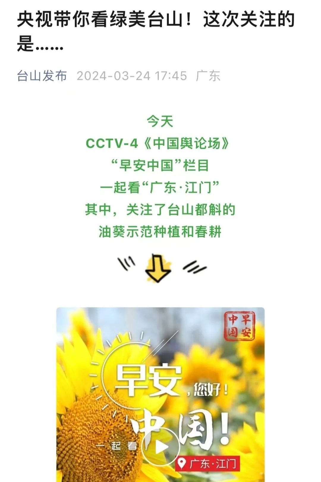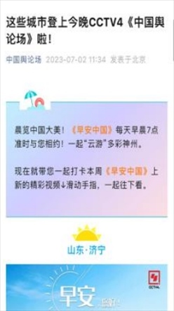 “央視帶你看綠美臺山,這次關(guān)注的是......”“就在明早7點!央視奉上重慶大足人文美景,向全球觀眾道早安!”“央視聚焦!徐州,有美景,有年味”“金葵向陽開,中春好景和風(fēng)裁!美麗江門與您相遇央視《早安中國》”……越來越多的地方政府伸出橄欖枝,希望《早安中國》多“來”當?shù)匾挥[好風(fēng)光。