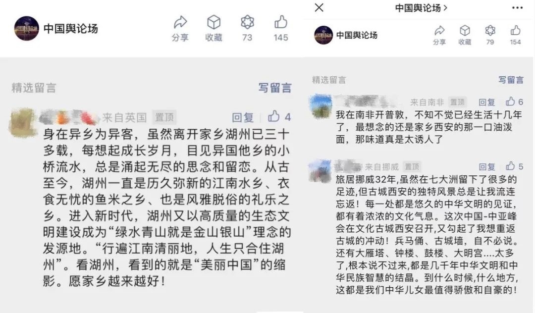 “早安中國切口新穎,有文化屬性和微記錄的氣質(zhì)?!薄懊看纹驳慕Y(jié)語字幕,都是從哪里選的?每天,都給我學(xué)習(xí)的機會?!薄皩I(yè)微記錄是媒體融合最寬廣的路?!薄对绨仓袊氛嬲媲星械鼐徑饬嗽S多海內(nèi)外網(wǎng)友的故土思鄉(xiāng)情切,也收到了來自四面八方的認可及反饋。《中國輿論場》節(jié)目持續(xù)發(fā)出“游子看故鄉(xiāng)”征集令,請海外華僑華人說出對家鄉(xiāng)的思念和心中最想“打卡”的祖國美景。