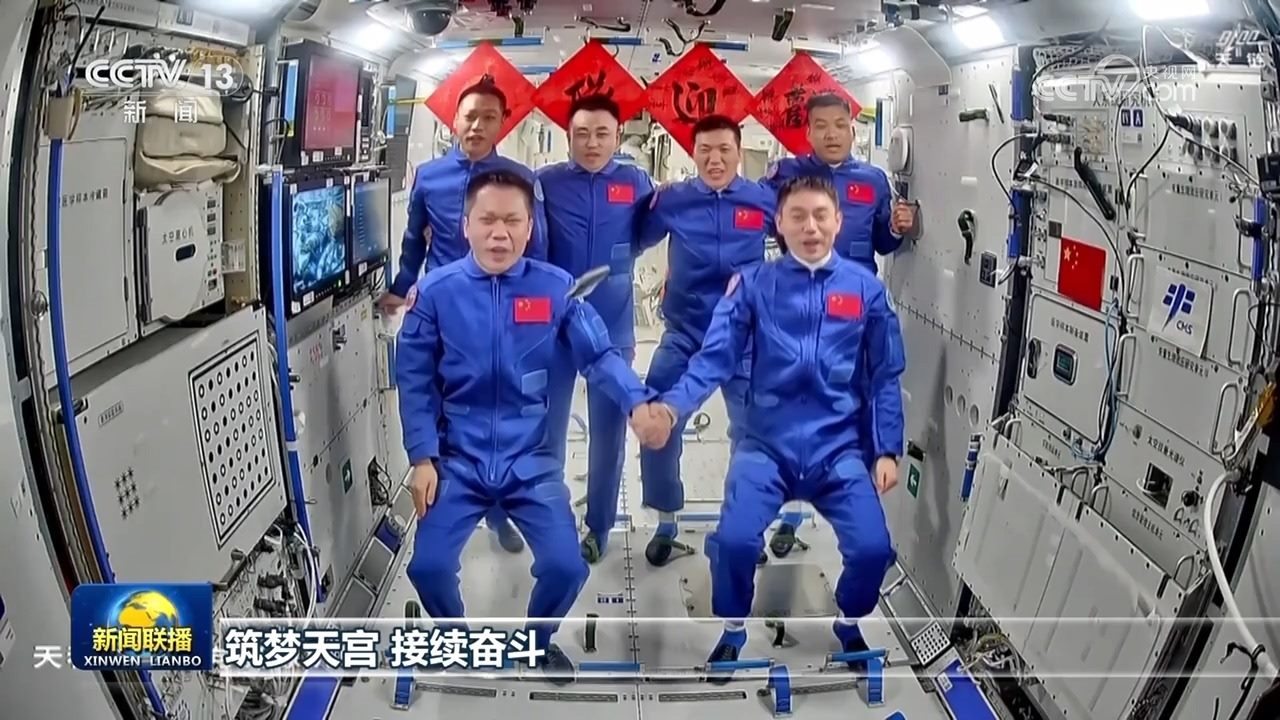 5時04分,在軌執(zhí)行任務的神舟十七號航天員乘組順利打開“家門”,歡迎遠道而來的神舟十八號航天員乘組入駐“天宮”。