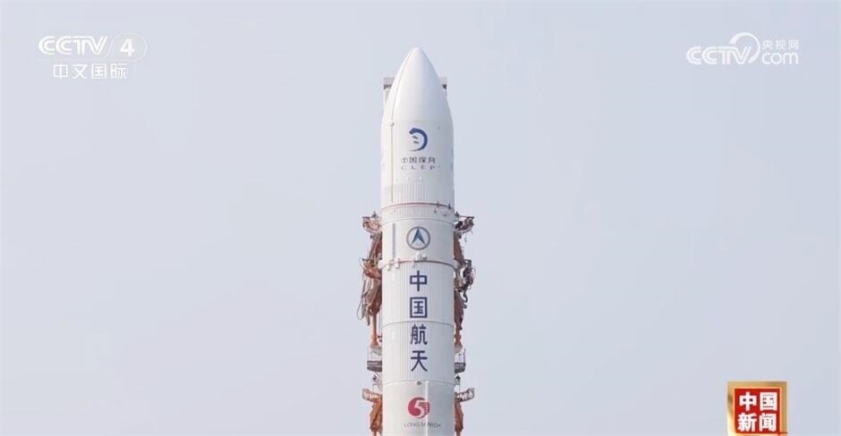 4月27日,在中國文昌航天發(fā)射場,嫦娥六號探測器和長征五號遙八運載火箭器箭組合體垂直轉運至發(fā)射區(qū),計劃于5月初擇機發(fā)射。