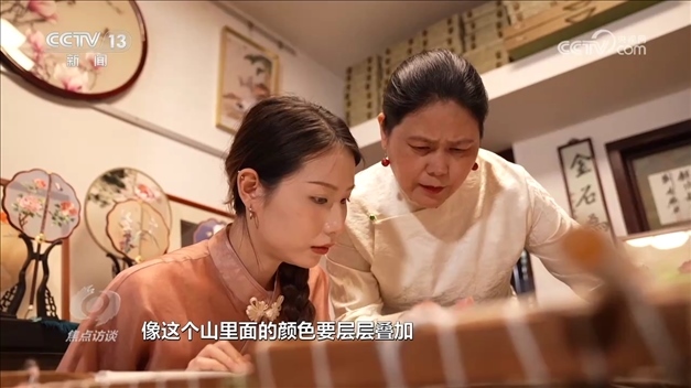 盧建英是蘇州當(dāng)?shù)赜忻奶K繡代表性傳承人。記者見到她的時(shí)候,她正在指導(dǎo)女兒刺繡。