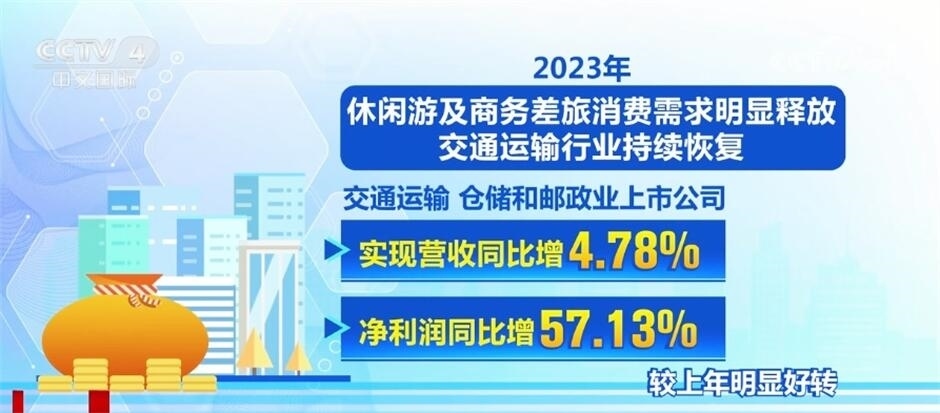 2023年,休閑游及商務(wù)差旅消費需求明顯釋放,交通運輸行業(yè)持續(xù)恢復(fù),交通運輸、倉儲和郵政業(yè)上市公司實現(xiàn)營收、凈利潤同比增4.78%、57.13%,較上年明顯好轉(zhuǎn)。