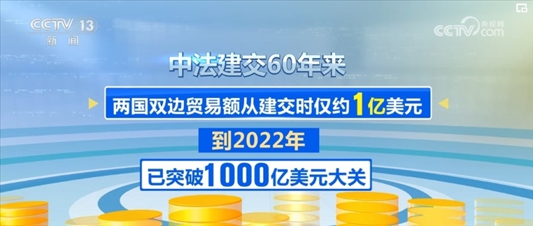 中法建交60年來(lái),兩國(guó)雙邊貿(mào)易額從建交時(shí)僅約1億美元,到2022年已突破1000億美元大關(guān)。如今,法國(guó)是中國(guó)在歐盟內(nèi)第三大貿(mào)易伙伴和第三大實(shí)際投資來(lái)源國(guó),中國(guó)則是法國(guó)在亞洲第一大貿(mào)易伙伴。