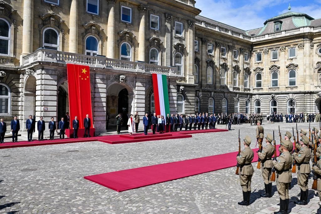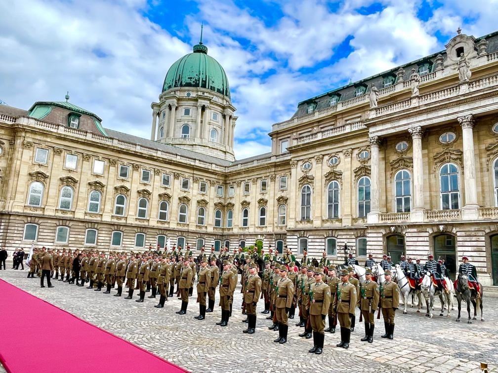 初夏時節(jié)的布達佩斯陽光明媚,古老宏偉的布達王宮莊嚴(yán)矗立,中匈兩國國旗相映成輝。習(xí)近平和夫人彭麗媛乘坐的國賓車隊在匈牙利禮賓馬隊護衛(wèi)下緩緩駛?cè)氩歼_王宮內(nèi)庭。舒尤克總統(tǒng)夫婦和歐爾班總理夫婦熱情迎接。
