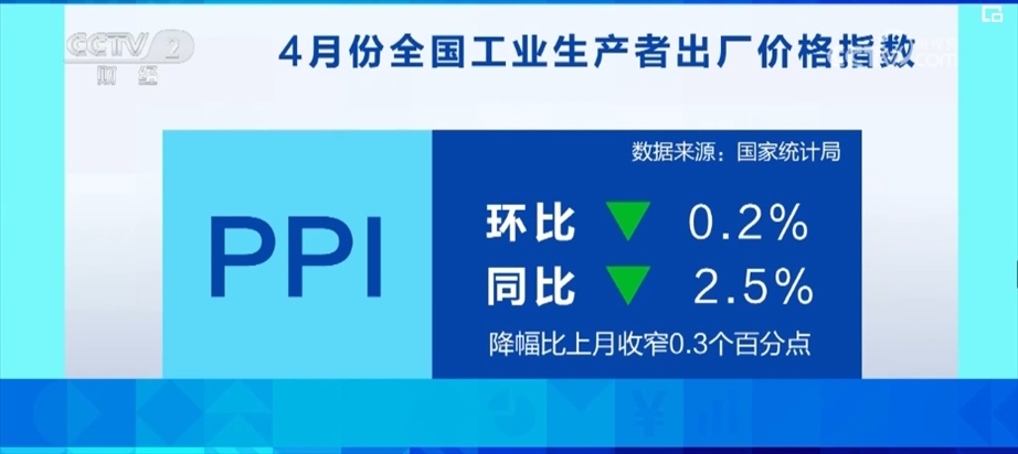 4月份,工業(yè)生產繼續(xù)恢復,全國工業(yè)生產者出廠價格指數PPI環(huán)比下降0.2%,同比下降2.5%,降幅比上月收窄0.3個百分點。