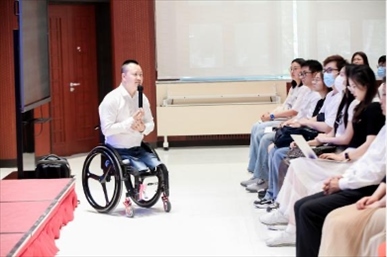 ?下圖為2023年5月,作為四川殘疾人勵志報告團成員的代國宏走進北京大學,與學生交流。(四川省殘聯供圖)