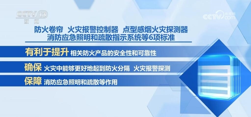 防火卷簾、火災(zāi)報(bào)警控制器、點(diǎn)型感煙火災(zāi)探測(cè)器、消防應(yīng)急照明和疏散指示系統(tǒng)等6項(xiàng)標(biāo)準(zhǔn)有利于提升相關(guān)防火產(chǎn)品的安全性和可靠性,確保其在火災(zāi)中能夠更好地起到防火分隔、火災(zāi)報(bào)警探測(cè),保障消防應(yīng)急照明和疏散等作用。應(yīng)急避難場(chǎng)所、救災(zāi)帳篷等4項(xiàng)標(biāo)準(zhǔn)可確保受災(zāi)人員得到更安全、更舒適的臨時(shí)安置。