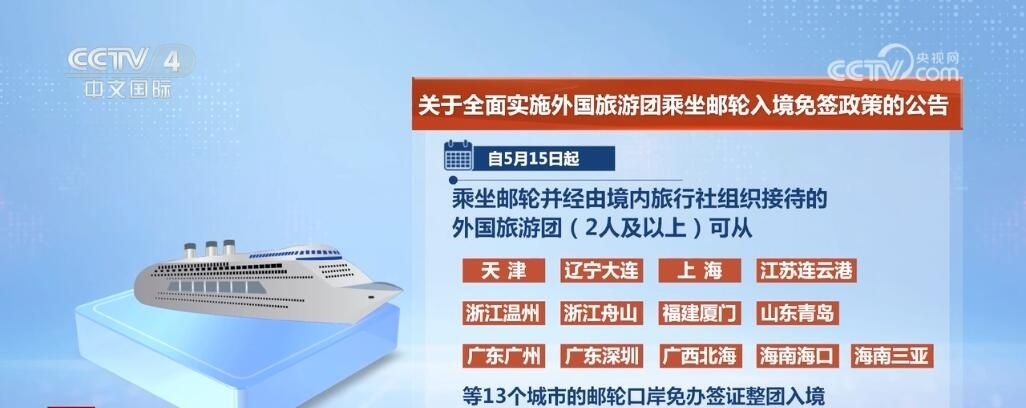 央視網(wǎng)消息:中國國家移民管理局發(fā)布公告,為進(jìn)一步促進(jìn)便利外籍人員來華旅游,自5月15日起,在中國沿海省份全面實施外國旅游團(tuán)乘坐郵輪入境免簽政策,乘坐郵輪來華并經(jīng)由境內(nèi)旅行社組織接待的外國旅游團(tuán)可從中國沿海所有郵輪口岸免辦簽證入境停留15天。