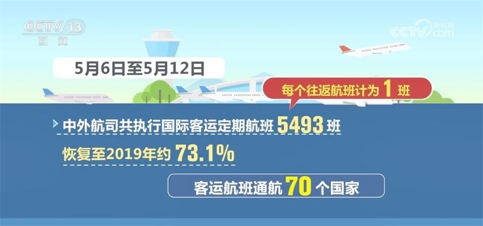 中國(guó)民航局?jǐn)?shù)據(jù)顯示,5月6日至5月12日,中外航司共執(zhí)行國(guó)際客運(yùn)定期航班5493班(每個(gè)往返航班計(jì)為1班),恢復(fù)至2019年約73.1%,客運(yùn)航班通航70個(gè)國(guó)家。