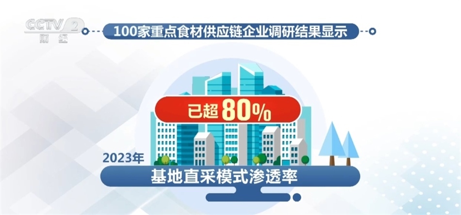 我國食材供應鏈企業(yè)鏈條逐漸向上游延伸。100家重點食材供應鏈企業(yè)調(diào)研結(jié)果顯示,2023年基地直采模式滲透率已超80%,有效縮短供應鏈鏈條,降低食材采購和流通成本。