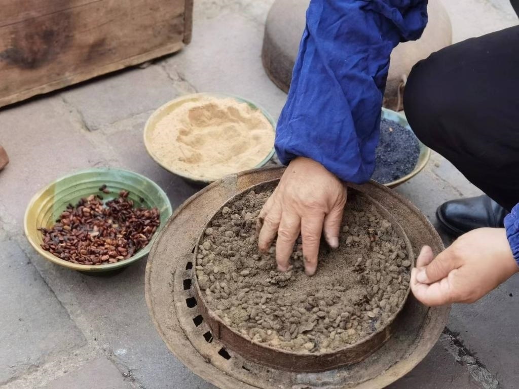沖好針孔,便在磨石上反復(fù)銼尖。隨后倒入熱鍋里翻炒,再舀入一瓢水,針的剛性和硬度由此增加。接下來便輪到三大碗“大陽秘方”登場:白崖土粉末、松木炭和發(fā)酵后的豆豉,用于蒸針?!八赡咎靠梢栽黾愉撫樀暮剂浚嵘捕?;豆豉增加亮度;白崖土粉末作為分散劑讓針受熱均勻。這樣處理后可以保證針質(zhì)更堅硬又有光澤?!?/p>