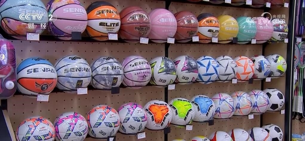 這里是義烏國(guó)際商貿(mào)城三區(qū),擺滿了各種體育用品。記者了解到,最近籃球、足球、排球等體育用品訂單猛漲。