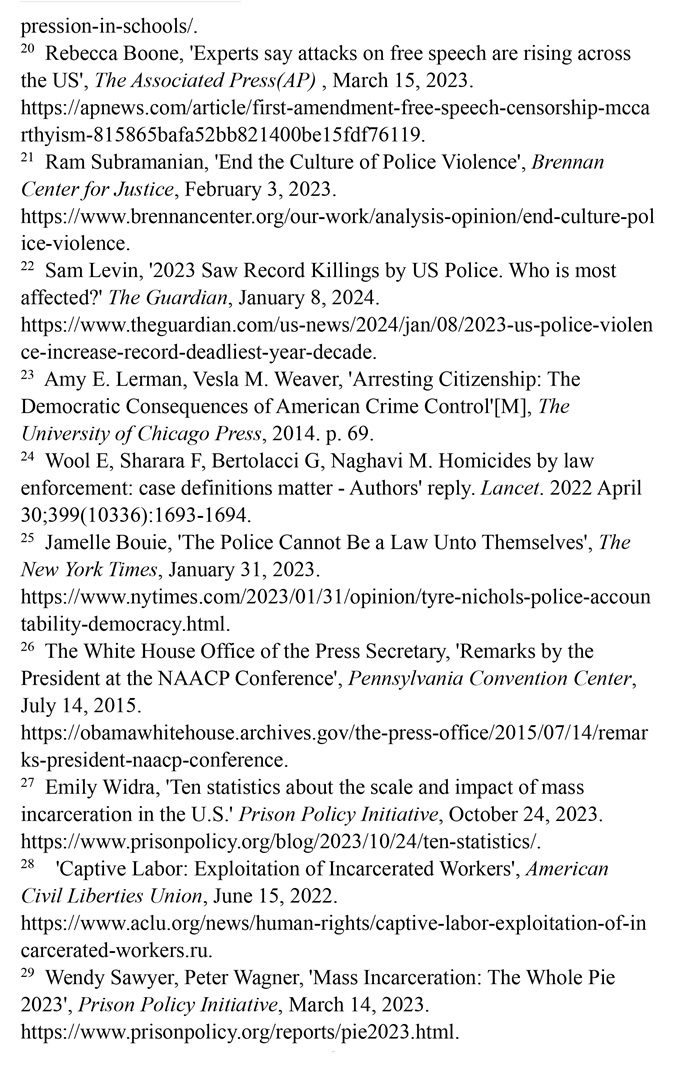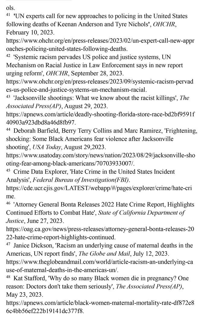 非洲裔在執(zhí)法領(lǐng)域面臨嚴(yán)重種族歧視。2023年1月3日,洛杉磯31歲的非洲裔男子基南·安德森涉嫌交通肇事,警方在制服他的過程中使用電擊槍擊中其6次,致其心臟病發(fā),送醫(yī)不治身亡。(注39)2023年1月7日,田納西州孟菲斯市的警察以“魯莽駕駛”為由將29歲的非洲裔男子泰爾·尼科爾斯攔下,并對其進(jìn)行長達(dá)數(shù)分鐘的殘忍毆打。三天后尼科爾斯因傷勢過重去世,而事后的調(diào)查無法證實(shí)警察關(guān)于其“魯莽駕駛”的說法。(注40)這兩起非洲裔遭受警察暴力執(zhí)法身亡案例引發(fā)多名聯(lián)合國專家的高度關(guān)注。專家們強(qiáng)調(diào),在兩起事件中,警察使用的武力違反保護(hù)生命權(quán),禁止酷刑和其他殘忍、不人道或有辱人格待遇或處罰的國際準(zhǔn)則,也不符合聯(lián)合國《執(zhí)法人員行為守則》和《執(zhí)法人員使用武力和火器的基本原則》。(注41)聯(lián)合國人權(quán)理事會在執(zhí)法工作中推進(jìn)種族正義和平等的國際獨(dú)立專家機(jī)制在對美國實(shí)地訪問后發(fā)布報(bào)告指出,針對非洲裔的系統(tǒng)性種族主義已經(jīng)滲透到美國警察隊(duì)伍和刑事司法系統(tǒng)。非洲裔被警察殺害的可能性是白人的3倍,被監(jiān)禁的可能性是白人的4.5倍。在每年1000多起警察殺人案件中,只有1%的涉事警察被指控。報(bào)告警告說,美國如果不按照國際標(biāo)準(zhǔn)改革警察使用武力的規(guī)則,許多殺戮將繼續(xù)發(fā)生。(注42)