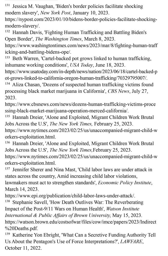 邊境政策助長現(xiàn)代奴隸制。美國政府的邊境政策加劇人口販運(yùn)問題。被遺棄在邊境州城鎮(zhèn)或被運(yùn)往全國各地的移民,往往處于孤立無援境地,最容易受到剝削和販運(yùn)。那些非法越境后聚集在擁擠、缺乏監(jiān)管的庇護(hù)所的兒童也成為人口販子的獵物。(注131)在美國被販運(yùn)的人中,72%是移民,其中大部分是通過偷渡入境,人口販運(yùn)的受害者多是婦女和兒童。打擊販賣婦女聯(lián)盟的一項(xiàng)研究估計(jì),60%的越境無人陪伴移民兒童被犯罪集團(tuán)強(qiáng)迫從事兒童色情甚至販毒活動。(注132)《今日美國報(bào)》網(wǎng)站2023年6月18日報(bào)道,移民被販毒集團(tuán)誘騙到加利福尼亞州北部和俄勒岡州南部的農(nóng)場從事大麻種植,遭受奴役和強(qiáng)迫勞動。被販賣的移民在大麻農(nóng)場遭持槍恐嚇,每天被迫工作16個小時甚至更長時間,有時連飯都吃不上。移民婦女遭到性侵犯,有些人被謀殺,尸體被丟棄在荒野中。(注133)美國哥倫比亞廣播公司新聞網(wǎng)2023年7月27日報(bào)道,近60名遭人口販運(yùn)的受害者被偷運(yùn)到加利福尼亞中部的一個非法大麻種植場所,被強(qiáng)迫加工大麻,向偷運(yùn)者償還債務(wù)。(注134)