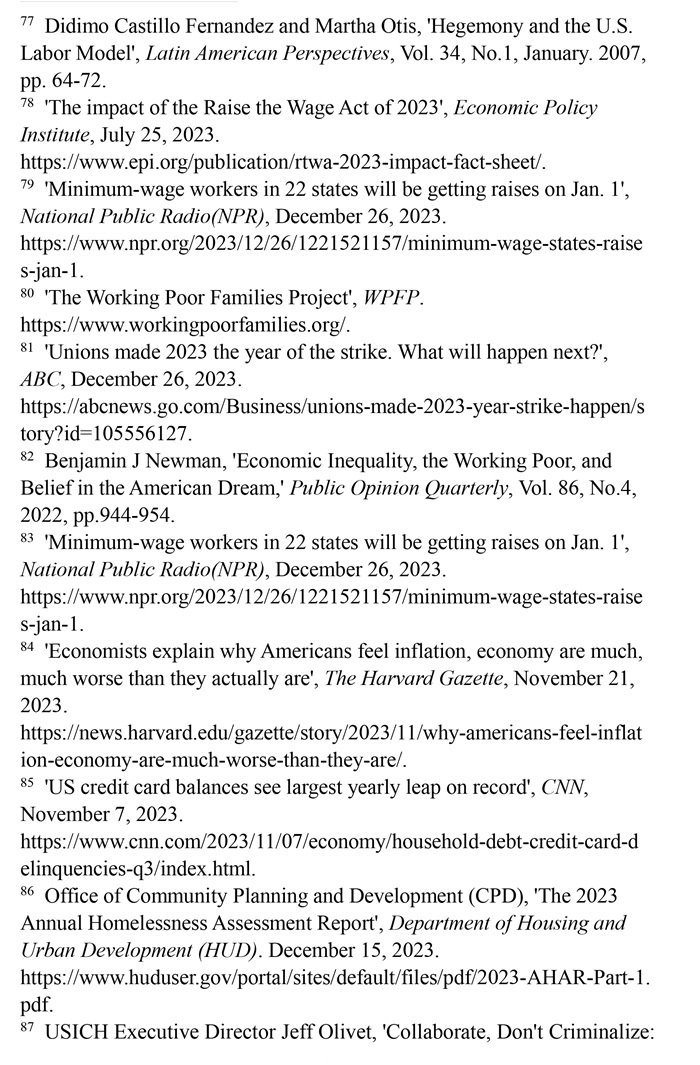 “工作者貧困”問題突出。美國勞動力市場狀況發(fā)生了結(jié)構(gòu)性變化,低薪崗位和缺乏監(jiān)管普遍存在。(注77)有大批“工作窮人”終日勞作,其工資水平卻難以維持基本生計(jì),還缺乏應(yīng)有的社會保障。美國聯(lián)邦最低時薪標(biāo)準(zhǔn)自2009年以來一直沒有上調(diào)。(注78)美國勞工部的數(shù)據(jù)顯示,2023年仍有20個州維持聯(lián)邦最低時薪標(biāo)準(zhǔn)。(注79)美國有1150萬個低收入工薪家庭,包括1480萬兒童在內(nèi)的2990多萬美國人生活在這些低收入工薪家庭。(注80)勞資收入增長懸殊導(dǎo)致多行業(yè)大面積罷工。2023年,美國發(fā)生了21世紀(jì)以來波及范圍最廣的罷工潮,包括影視、制造、醫(yī)療、媒體在內(nèi)的多個行業(yè)都出現(xiàn)大規(guī)模罷工。(注81)加利福尼亞州大學(xué)公共政策與政治學(xué)院副教授本杰明·紐曼評論稱,陷入結(jié)構(gòu)性貧困之中的“工作窮人”既缺乏機(jī)會平等,也難以向上流動,他們極大地降低了對“美國夢”的信念。(注82)