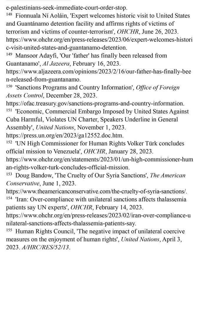 長期濫施單邊制裁造成嚴(yán)重人道主義后果。自1950年以來,美國使用的制裁次數(shù)居全球之首。根據(jù)美國財(cái)政部2023年12月28日公布的數(shù)據(jù),美國制裁的國家超過20個。(注150)第78屆聯(lián)合國大會發(fā)言人2023年11月1日指出,美國對古巴實(shí)施的經(jīng)濟(jì)、商業(yè)和金融封鎖違反了《聯(lián)合國憲章》,對古巴人民造成了毀滅性影響。(注151)聯(lián)合國大會2023年11月2日通過決議,再次敦促美國終止對古巴長達(dá)60多年的經(jīng)濟(jì)、商業(yè)和金融封鎖,這是聯(lián)合國大會連續(xù)第31年通過類似決議。2023年1月28日,聯(lián)合國人權(quán)事務(wù)高級專員沃爾克·圖爾克在訪問委內(nèi)瑞拉后表示,2017年以來美國施加的制裁加劇了委內(nèi)瑞拉的經(jīng)濟(jì)危機(jī),嚴(yán)重阻礙人權(quán)的實(shí)現(xiàn)。(注152)“美國保守派”網(wǎng)站2023年6月1日報(bào)道,美國制裁進(jìn)一步加劇了敘利亞人民的貧困。敘利亞70%的人口面臨食物短缺,其中1200萬人三餐不繼,290萬人食不果腹。(注153)聯(lián)合國人權(quán)理事會單邊強(qiáng)制措施對人權(quán)負(fù)面影響問題特別報(bào)告員阿萊娜·杜晗2023年2月14日指出,美國對伊朗的制裁減少了地中海貧血癥患者從國外進(jìn)口救命藥物的機(jī)會,導(dǎo)致伊朗患者的并發(fā)癥和死亡率增加,是對健康權(quán)的侵犯。(注154)聯(lián)合國人權(quán)理事會2023年4月3日通過決議指出,單邊強(qiáng)制性措施會對目標(biāo)國家廣大民眾的人權(quán)產(chǎn)生深遠(yuǎn)影響,對窮人和處境最脆弱的人影響尤為嚴(yán)重。決議譴責(zé)某些大國繼續(xù)單方面適用單邊強(qiáng)制性措施。美國在該決議表決中投了反對票。(注155)