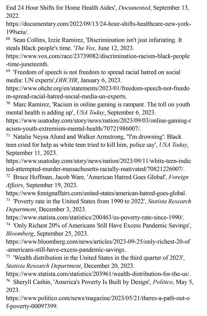 少數(shù)族裔遭遇職場歧視。美國一家名為“溫室”的招聘軟件公司發(fā)布的《2023年求職者面試經(jīng)歷報(bào)告》顯示,招聘過程中的歧視現(xiàn)象“相當(dāng)令人擔(dān)憂”。34%的求職者在面試中遇到過歧視性問題,近1/5的求職者曾試圖通過在簡歷中更改姓名,以避免受歧視性招聘行為的影響。在改名的求職者中,有45%是為了讓自己聽起來“不那么有族裔特點(diǎn)”。(注65)英國《衛(wèi)報(bào)》網(wǎng)站2023年4月23日披露,美國政府?dāng)?shù)十年來刻意逃避勞工保護(hù)責(zé)任,壓榨少數(shù)族裔勞工。紐約的有色族裔護(hù)工不僅被迫接受連續(xù)長時間的工作,薪資還受到克扣。不少護(hù)工因此罹患失眠、慢性病等疾病,對護(hù)工及其家庭造成嚴(yán)重傷害。(注66)少數(shù)族裔勞工一直嘗試通過各種渠道爭取權(quán)利保障,但在一些利益集團(tuán)阻礙下成效寥寥。(注67)沃克斯新聞網(wǎng)2023年6月12日報(bào)道,在美國,非洲裔一直比白人掙得少。這種差異意味著在種族歧視的影響下,非洲裔時間價(jià)值明顯低于白人,為了彌補(bǔ)歧視造成的工資差距,非洲裔工人每天必須多工作2.7小時。(注68)