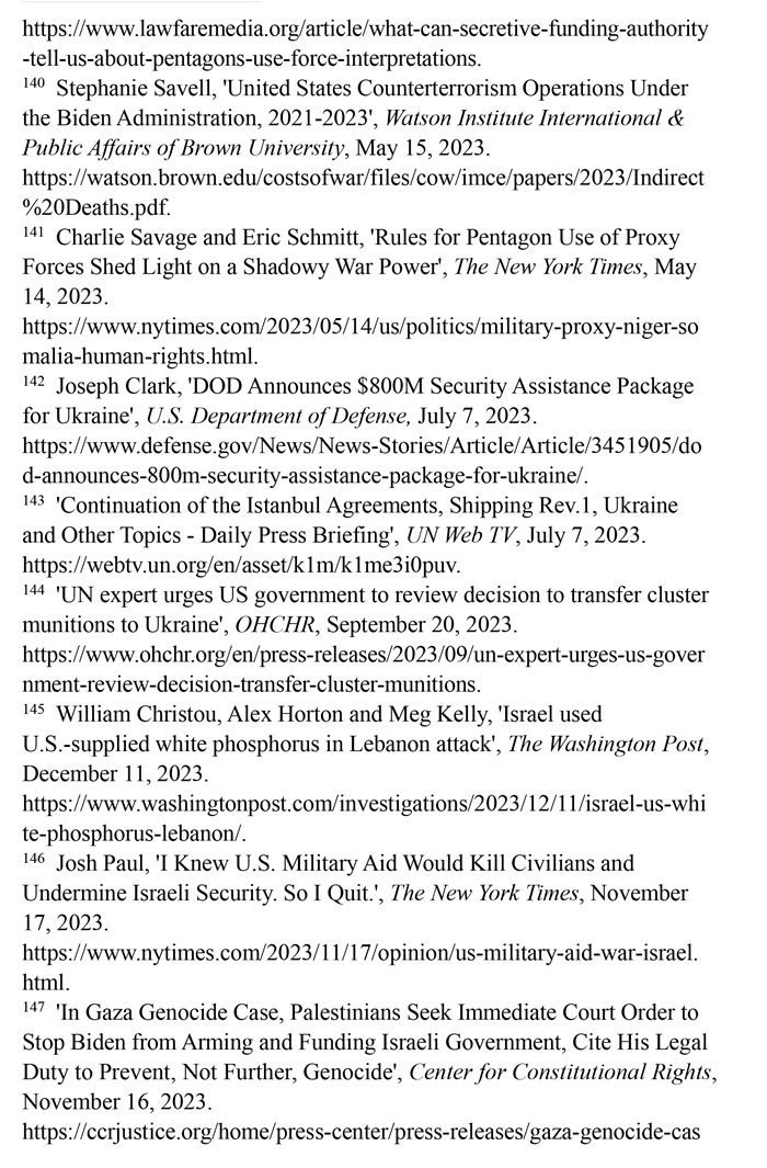 持續(xù)向沖突地區(qū)提供武器。美國國防部2023年7月7日發(fā)布的新聞稿顯示,美國向?yàn)蹩颂m提供的價(jià)值8億美元的額外軍事援助中,包含大量集束彈藥。(注142)聯(lián)合國秘書長副發(fā)言人哈克2023年7月7日回答記者提問時表示,聯(lián)合國秘書長安東尼奧·古特雷斯希望各國遵守《集束彈藥公約》,不要在戰(zhàn)場上繼續(xù)使用集束彈藥。(注143)聯(lián)合國人權(quán)高專辦網(wǎng)站2023年9月20日報(bào)道,聯(lián)合國人權(quán)理事會酷刑和其他殘忍、不人道或有辱人格的待遇或處罰問題特別報(bào)告員愛麗絲·吉爾·愛德華茲2023年7月向美國政府發(fā)出緊急信函,警告集束彈藥會對平民造成嚴(yán)重傷害。(注144)《華盛頓郵報(bào)》網(wǎng)站2023年12月11日報(bào)道,美國每年流入以色列的軍火達(dá)數(shù)十億美元,以色列在10月對黎巴嫩南部的一次襲擊中使用了美國供應(yīng)的白磷彈藥,造成至少9名平民受傷。(注145)美國國務(wù)院政治軍事事務(wù)局前局長喬?!けA_2023年10月18日在《紐約時報(bào)》網(wǎng)站發(fā)表專欄文章指出,美國每年向以色列提供至少38億美元軍事援助,加沙地帶最嚴(yán)重的人員傷亡大多是由美國提供的彈藥所導(dǎo)致,譴責(zé)這種軍事援助無視人權(quán)問題。(注146)美國人權(quán)組織“憲法權(quán)利中心”2023年11月16日報(bào)道,滅絕種族與死刑問題專家威廉·沙巴斯指責(zé)美國未能履行防止種族滅絕的法律義務(wù),違反了習(xí)慣國際法和《防止及懲治滅絕種族罪公約》。(注147)