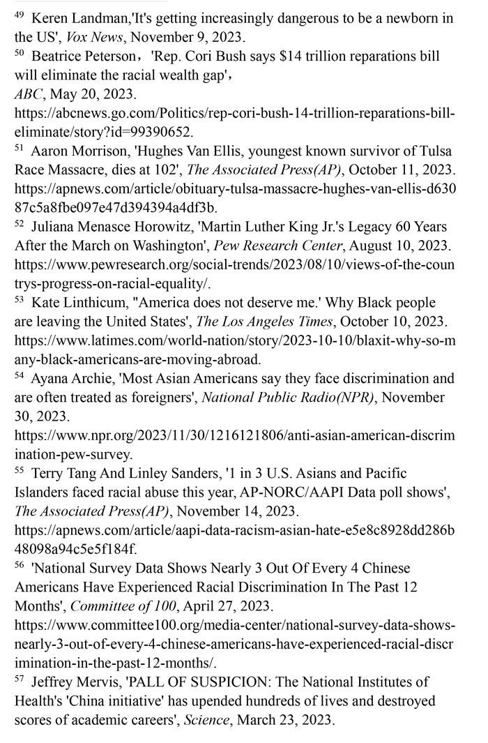對華裔科學(xué)家的迫害仍在持續(xù)。雖然美國政府針對華裔科學(xué)家的“中國行動計(jì)劃”被暫停,但該計(jì)劃帶來的深遠(yuǎn)影響?yīng)q在,眾多華裔科學(xué)家仍然有強(qiáng)烈的不安全感。美國《科學(xué)》雜志2023年3月23日刊發(fā)文章,講述了“中國行動計(jì)劃”對華裔科學(xué)家的迫害。在被美國國立衛(wèi)生研究院調(diào)查的246人中,103人失去工作,超過五分之一的人被禁止在4年內(nèi)申請國立衛(wèi)生研究院資助,給他們的學(xué)術(shù)生涯帶來重大打擊。這246人中有81%的科學(xué)家是亞裔。(注57)普林斯頓大學(xué)、哈佛大學(xué)和麻省理工學(xué)院對近1400名在美國大學(xué)擔(dān)任終身教職的華裔美國人的調(diào)查顯示,72%的人表示沒有安全感,42%的人害怕在美國開展研究。(注58)