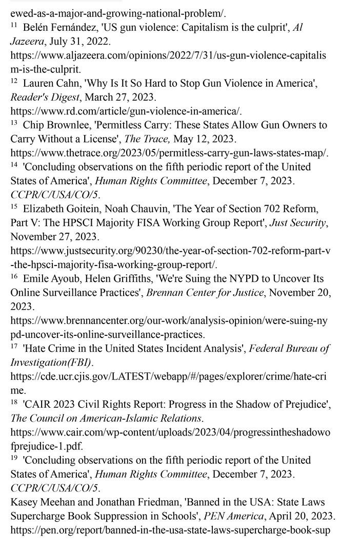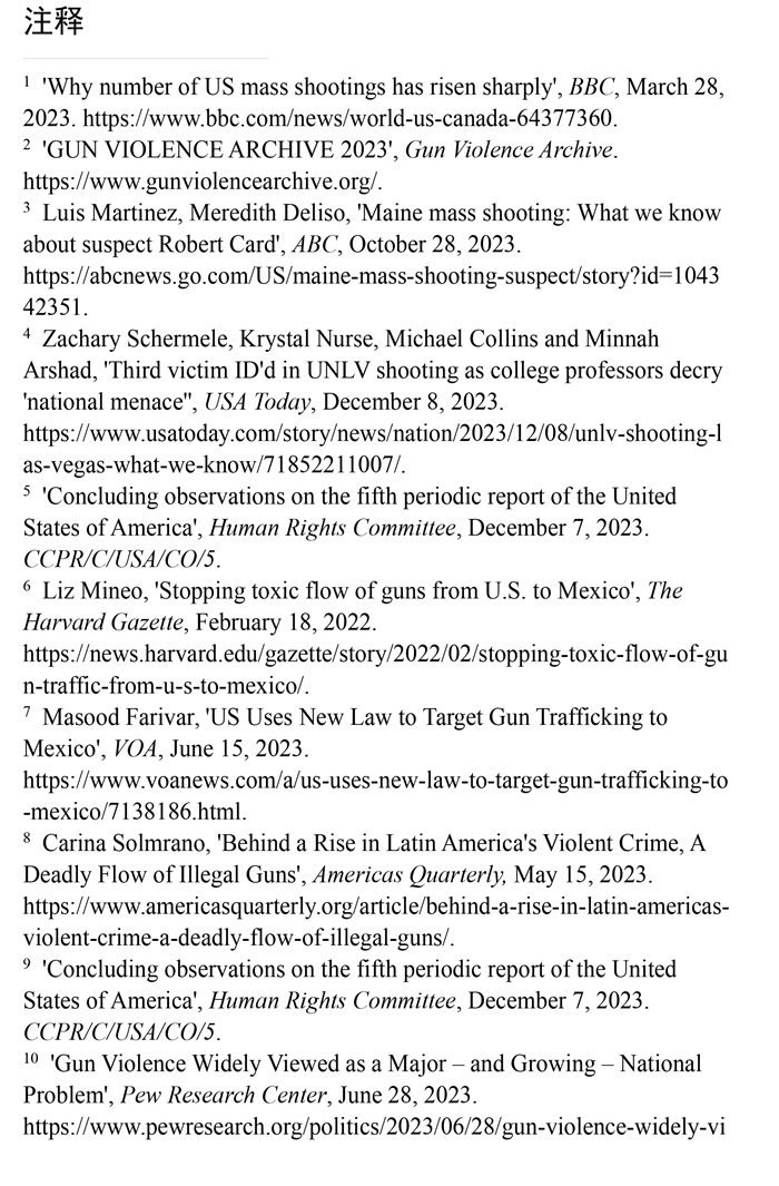 槍支暴力造成慘痛生命代價(jià)。數(shù)據(jù)顯示,美國所有類型的槍支暴力事件都呈上升趨勢。(注1)根據(jù)“槍支暴力檔案”網(wǎng)站統(tǒng)計(jì)的數(shù)據(jù),2023年美國至少發(fā)生了654起大規(guī)模槍擊事件。槍支暴力導(dǎo)致近4.3萬人死亡,平均每天死亡117人。(注2)例如,美國廣播公司新聞網(wǎng)站2023年10月28日報(bào)道,緬因州發(fā)生大規(guī)模槍擊事件,造成至少18人死亡,13人受傷。(注3)《今日美國報(bào)》網(wǎng)站2023年12月6日報(bào)道,拉斯維加斯3名大學(xué)教授被一名前同事槍殺。美國大學(xué)教授協(xié)會主席艾琳·馬爾維稱,槍支暴力是“不可接受的國家威脅”,敦促美國政府進(jìn)行槍支政策改革。(注4)美國與槍支有關(guān)的傷亡人數(shù)激增,引發(fā)聯(lián)合國人權(quán)事務(wù)委員會的嚴(yán)重關(guān)切。(注5)